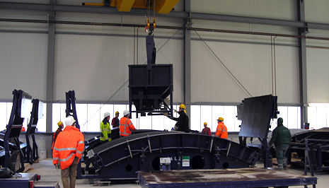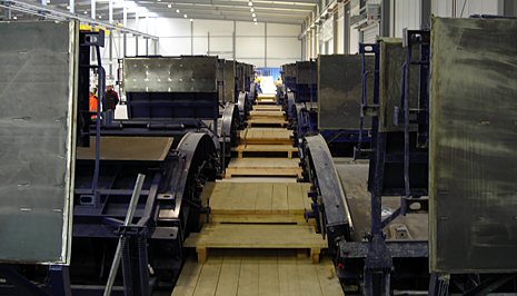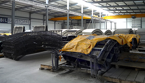 In der Fabrikhalle befinden sich mehrere Gießformen, sogenannte Schalungssätze,